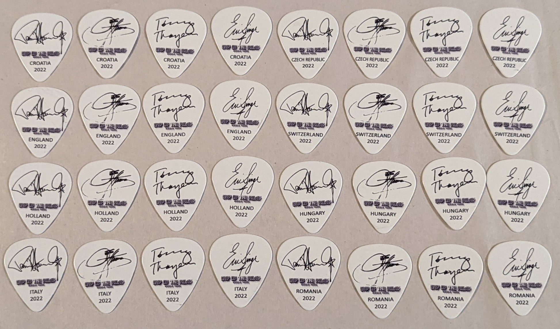 Special Guitar picks were made for every country visited during the End Of the Road World Tour featuring each countries flag. 50 each of these special Guitar Picks were thrown out nightly